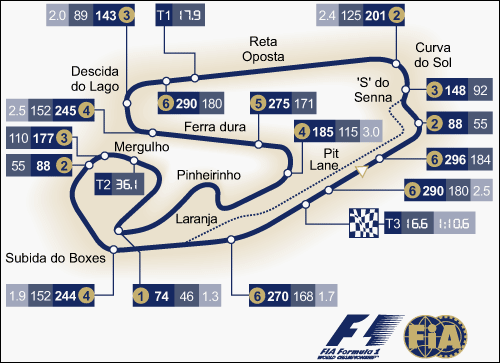Трасса требовательна к мощности мотора и заставляет искать традиционный компромисс между сцеплением с трассой в медленном втором и скоростью в первом и третьем секторе. Обычно моторы здесь не так эффективны, как на других трассах - Интерлагос находится на возвышенности (более 750 метров над уровнем моря), так что инженерам приходится решать уравнение с множеством переменных, да и погода здесь традиционно непредсказуема.