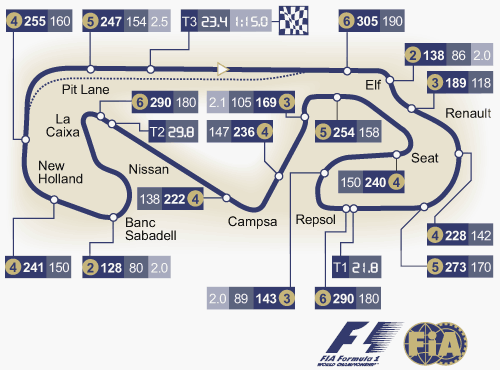 Круг по трассе: Педро де ла Роса: "После разгона по стартовой прямой до шестой передачи и 316 км/ч вы резко тормозите перед правым поворотом Elf до 137 км/ч и второй передачи, при этом перегрузки могут достигать 2.4G. Второй поворот - 187 км/ч и третья передача, он важен в квалификации, если вы хотите показать хорошее время на круге. Впереди - длинный быстрый поворот Renault, до входа в Repsol вы разгоняете машину до 286 км/ч и шестой передачи, а потом тормозите до 131 км/ч и третьей передачи. Здесь важно найти компромисс между безопасным прохождением поворота и скоростью, а потом - короткий удар по педали газа и торможение перед Seat - самым медленным поворотом трассы, который проходится на второй передаче и 97 км/ч.
