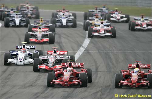 Круг 1: Райкконен стартует с поула, за ним Масса опережает Алонсо. Во втором повороте сталкиваются две BMW - Хайдфельд выносит Кубицу. Хэмилтон прорывается с 10-го на 4-е место. Начинается дождь и хаос. Лидер Райкконен пытается заехать на пит-лейн, но не справляется с управлением и его выносит на трассу. На смену шин заезжают Масса, Алонсо, Шумахер, Трулли, Уэббер. Проезжают мимо Сато и Физикелла. Баттон заезжает на пит-стоп, Винкельхок нет. Заезжает Ковалайнен, Кубица остается на трассе. Все остальные заезжают на пит-лейн - Спид, Лиуцци, Дэвидсон, Вурц, Росберг, побывавший в гравии Култхард, Хэмилтон с медленным проколом, Баррикелло, Хайдфельд и Сутил.