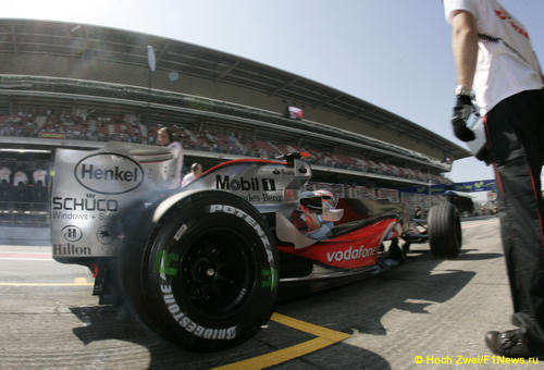 Дуэт McLaren возглавил протокол первой части свободных заездов Гран При Испании. Лидеры чемпионата явно работали над гоночными настройками, показавший лучшее время на более мягкой резине Льюис Хэмилтон уступил восемь десятых рекорду новой конфигурации трассы, неделю назад установленному Дэвидом Култхардом, когда шотландец проехал по трассе с пустыми баками, отрабатывая квалификацию.