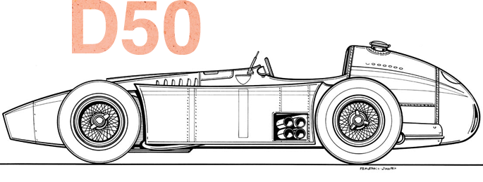 Проект D50 был весьма новаторским для своего времени, в каком-то смысле даже революционным. Чтобы улучшить аэродинамику и управляемость машины, главный конструктор Витторио Яно разместил топливные баки в специальных обтекателях, установленных по бокам от кокпита. Такая компоновка позволила оптимизировать поведение машины при полных и пустых баках и сделала D50 конкурентоспособной как на медленных, так и на быстрых трассах.