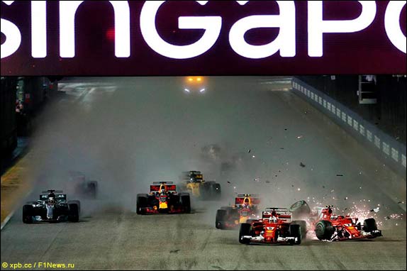 Впрочем, эти минуты в значительной степени определили исход гонки. С поула стартовал Феттель, позади него гонку начинали две машины Red Bull Racing и Кими Райкконен, но уже к пятому повороту гонку возглавил Хэмилтон. Это стало следствием живописной аварии на стартовой прямой, когда две машины Ferrari взяли в клещи Ферстаппена, после чего гонка для всех троих, по сути, закончилась.