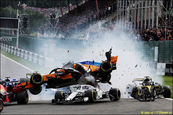 Впрочем, Спа есть Спа – результат квалификации здесь не играет определяющей роли. Уже на старте гонку возглавил Феттель, а пелотон значительно поредел – Хюлкенберг врезался в Алонсо, машина испанца подлетела в воздух и выбила с трассы Леклера, чиркнув по Halo. Все трое в итоге сошли. Кроме того, Райкконен врезался в Риккардо, а Боттас – в Сироткина.