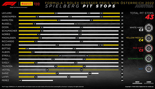 После финиша Гран При Австрии в Pirelli опубликовали информацию о порядке смены шин на дистанции...