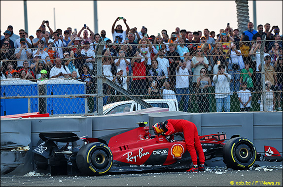 На десятой минуте сессию остановили красными флагами – Карлос Сайнс на большой скорости врезался в барьер. Трасса в Абу-Даби – одна из самых безопасных, но на выходе из третьего поворота Ferrari развернуло и бросило в барьер. Карлос сам выбрался из кокпита, а механикам Скудерии придётся поработать – левая часть машины здорово пострадала.