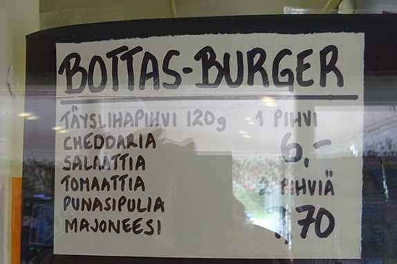 В меню на самом видном месте значится Bottas-Burger: котлета, сыр чеддер, салат, помидоры, красный лук и майонез. Версия с одной котлетой – 6 евро, с двумя – 7,70.