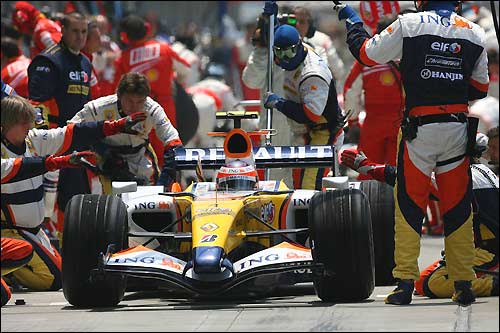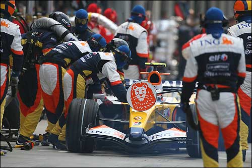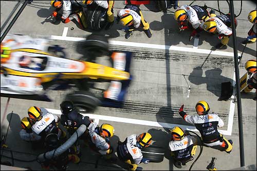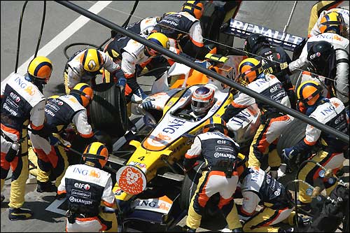 За сорок секунд до пит-стопа 28 механиков Renault покидают боксы и начинают готовить стандартную процедуру, которую они отрабатывают от сорока до шестидесяти раз за уик-энд. Если в пятницу и субботу можно говорить о рутине, то в часы гонки команда работает под невероятным прессингом, когда от небольшой задержки или ошибки зависит не только результат Хейкки, но и успех напряженной работы всей команды - инженеров, техников, механиков и гонщиков.
