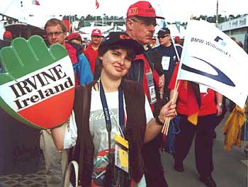 Несмотря на то, что наша трибуна совсем рядом со стендом, там уже полно народу. Вернее, мне так показалось сначала, потом я поняла, что, по сравнению с тем, сколько народу набилось к 14-30, сначала было совсем немного. Мы оказались где-то в 3 ряду. Но быстро поняли, что на этот раз нам повезло не очень, трибуну было видно только через железную опору. Ну да ладно, ждем Ральфа. Народ все прибывает. И меня начинает медленно, но упорно куда-то сносить. Здоровые мужики, пихаясь локтями, пытаются пробраться поближе. Меня просто впечатывают в девушку, которая в свою очередь впечатывается в железное ограждение. Ого, я уже во 2 ряду, я начинаю тихо проклинать свое непомерное любопытство. И какой черт дернул меня прийти сюда. И неплохо было бы вернуть себе сумку из толпы, камеру прижимаем к себе, не дай бог выдернут из рук и разобьют (вовсе не украдут, здесь не воруют). Девушки-продавщицы, чтобы развлечь толпу, начинают раздавать флажки, фотографии и наклейки. Лучше бы они этого не делали, ну давайте попихаемся еще немного, хуже наверное уже не будет. Неожиданно толпа пришла в движение, да что же это такое, выживу ли я, раздаются радостные крики, море красно-серебристо-сине-зеленых кепок радостно закачалось. И на сцене появился Ральф. Ну слава богу, хоть пришел. И вдруг чувствую, все успокоилось, можно даже услышать вопросы-ответы и увидеть радостно улыбающегося Ральфа. Пара фраз и он подходит к толпе, чтобы раздать автографы. "Все,- думаю я, - смерть моя пришла", но храбро протягиваю руку с фотографией. Чичас-чичас. Хотите автограф девушка, вырасти надо было повыше. Моя рука просто утонула в море других рук с кепками, открытками и фотографиями. И Ральф прошел в 15 сантиметрах от меня. Толпа колыхнулась за ним. Нет, только не это. Так ведь и затопчут. И я, кажется, что-то взвизгнула громко и по-русски. Дальше все было как в замедленном кино. Короче, Ральф остановился, повернулся, посмотрел мне прямо в глаза и взял фотографию из моей руки. Вернее, попытался, потому что все свои вещи, в том числе и фотографию, я держала очень крепко. Но он оказался очень упорным. Смотрит мне в глаза и тянет фотку к себе. Я тоже смотрю ему в глаза - и не отдаю. Но он все-таки сильнее, так что взял, расписался и протянул фотку мне, но тут толпа колыхнулась и фотка просто упала. Не поверите, но сердце у меня чуть не оборвалось. Хорошо девушка в первом ряду, подняла и вернула мне фотографию. Я, надо признать, пребывала в некотором ступоре, даже выбравшись кое-как из толпы. Что же все-таки случается с нормальным в обычное время человеком, если он так ведет себя. Нет, все-таки гонщики- это один мир, а мы -совсем другой. И когда эти миры ненароком встречаются, произойти может что угодно. Лично я, придя в себя, почувствовала себя полной идиоткой. Ну на кой мне этот автограф, это же не Эдик даже, а ведь чуть не затоптали. Тогда почему на душе так радостно? Странно все это и необычно, но ведь за острыми ощущениями мы и едем на "Гран-при".