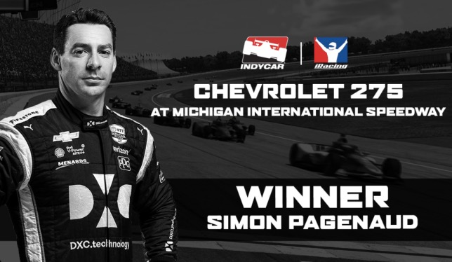Симон Пажено, победитель прошлогодней Indy 500, неплохо справляется и с пилотированием виртуальной машины: в субботу он выиграл третий этап серии IndyCar iRacing Challenge, на этот раз проходивший на овальном автодроме Michigan International Speedway.
