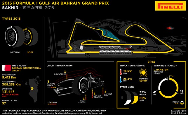 На этой неделе в Бахрейне команды будут использовать те же составы, что и в Шанхае – Medium и Soft, но совсем в других условиях. Гонка стартует вечером и финиширует ночью, так что температура будет постепенно снижаться, а абразивность асфальта в Сахире – самая большая в сезоне, не считая Хереса, где прошла первая серия зимних тестов.