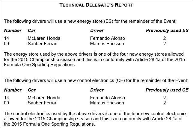 Фернандо Алонсо и Маркус Эриксон получили третий накопитель энергии и третий блок управляющей электроники из четырёх, разрешенных на сезон.