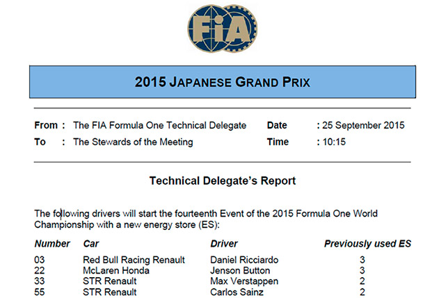 Перед утренними заездами в Японии на четырёх машинах были заменены элементы силовых установок. Даниэль Риккардо, Дженсон Баттон, Макс Ферстаппен и Карлос Сайнс начали уик-энд в Сузуке с новыми аккумуляторами системы рекуперации. Для Риккардо и Дженсона он стал четвёртым, для пилотов Toro Rosso – третьим.