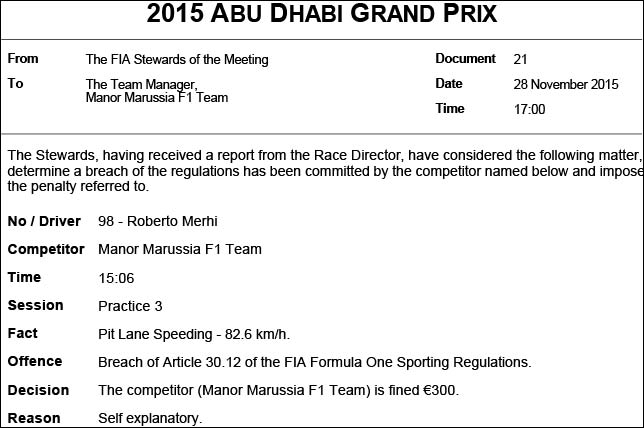 Стюарды Гран При Абу-Даби оштрафовали Manor Marussia за превышение скорости на пит-лейн, допущенное в третьей сессии свободных заездов Роберто Мери.