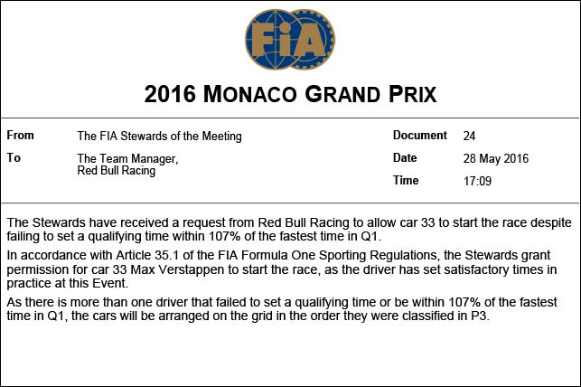 Макс Ферстаппен и Фелипе Наср не проехали быстрого круга в квалификации и не прошли рубеж 107% от времени лидера первой сессии, но после обращения команд стюарды Гран При Монако допустили их к участию в гонке, учитывая время, показанное гонщиками на свободных заездах.