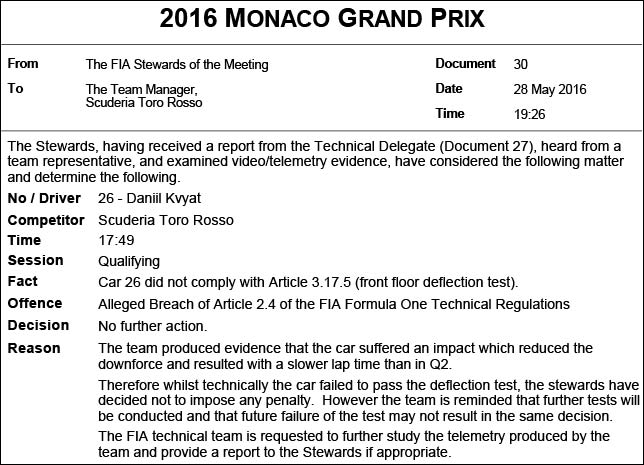 Рассмотрев вопрос несоответствия машины Даниила Квята техническому регламенту, стюарды Гран При Монако согласились с доводами команды о том, что это стало следствием внешнего воздействия на трассе, и отказались от каких-либо санкций в адрес гонщика и команды. Инцидент оставлен без последствий.