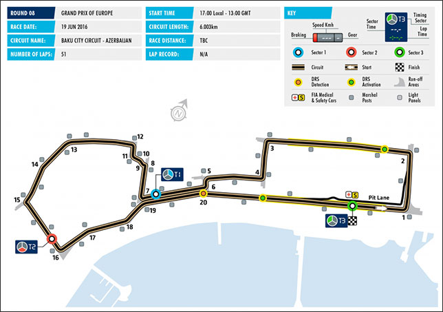 Среди характерных особенностей Baku City Circuit, трассы Гран При Европы, которая проходит по центральным районам столицы Азербайджана – нетипично длинные для городского кольца прямые отрезки. Скоростной участок от 16-го поворота до 1-го поворота превышает два километра, и вполне логично, что одна из двух зон DRS расположена именно там, на проспекте Нефтяников.
