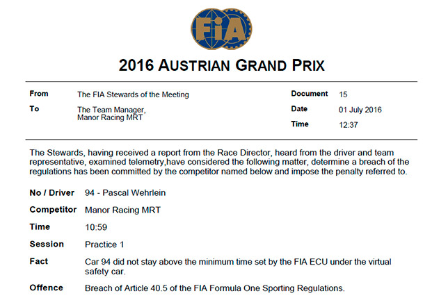 Стюарды Гран При Австрии вынесли предупреждение сразу троим пилотам: гонщикам Manor и Маркусу Эриксону.