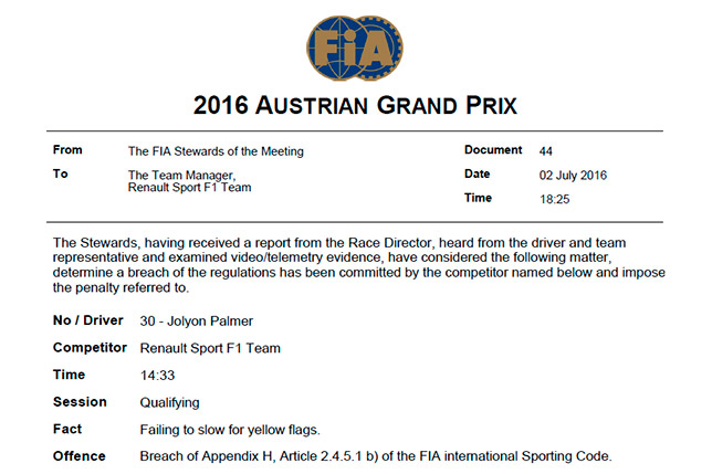 После окончания квалификации Гран При Австрии стюарды наказали потерей трёх позиций на стартовой решётке сразу троих пилотов – Джолиона Палмера, Фелипе Насра и Рио Харьянто. Все трое недостаточно замедлились в зоне жёлтых флагов. Помимо потери позиций, каждый из них также получил по два штрафных балла. Для Палмера это первое подобное наказание, а у Насра и Харьянто теперь по четыре балла.