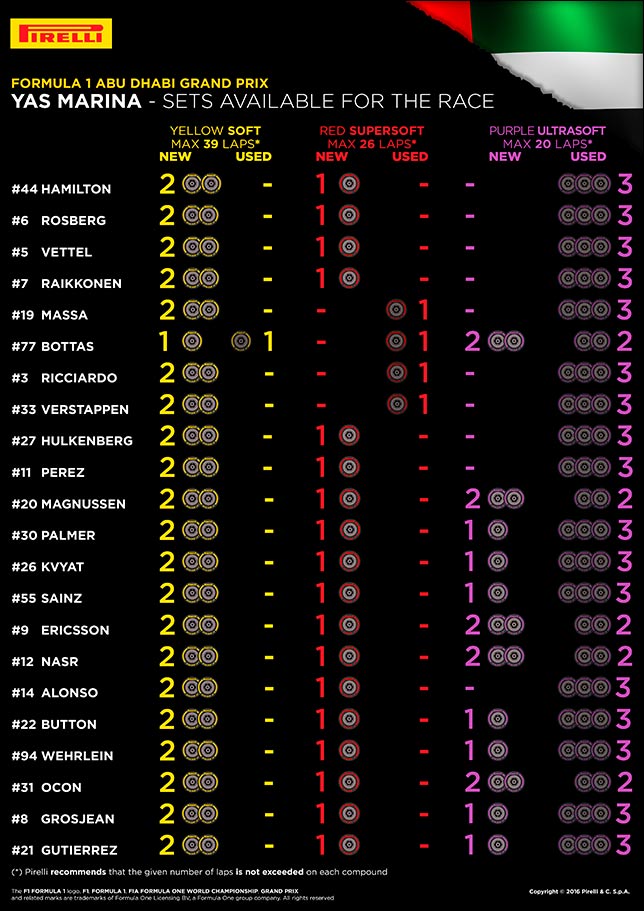 В Pirelli сообщили о числе комплектов шин трёх разных составов, доступных гонщикам в сегодняшней гонке – свежих и уже прикатанных.