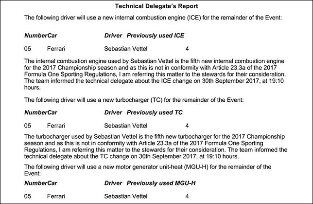 После возникших во время квалификации проблем в Ferrari решили заменить силовую установку на машине Себастьяна Феттеля, поставив в субботу вечером пятый двигатель внутреннего сгорания, пятую турбину и пятый MGU-H при четырёх разрешенных на сезон.