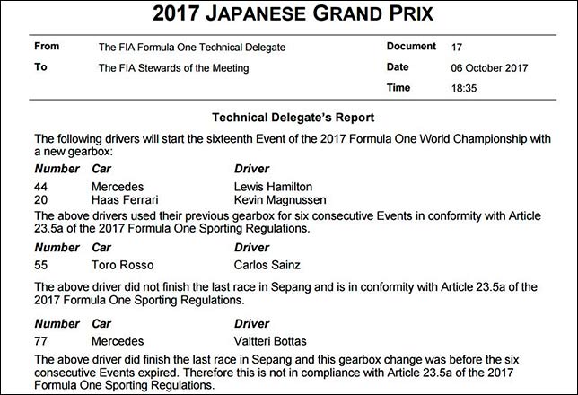 Замены коробок на машинах Хэмилтона и Магнуссена не будут наказаны – они проехали определённую регламентом дистанцию шести Гран При, а Сайнс получил возможность заменить коробку после схода в прошлой гонке.
