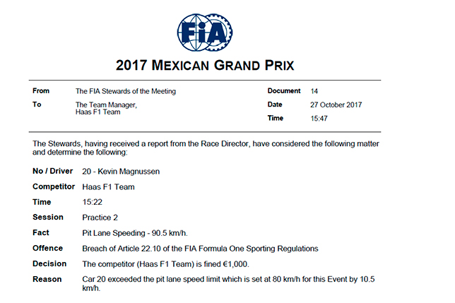 Во время второй тренировки Гран При Мексики Кевин Магнуссен превысил скорость на пит-лейн. Вместо разрешённых 80 км/ч он разогнался до 90,5 км/ч.