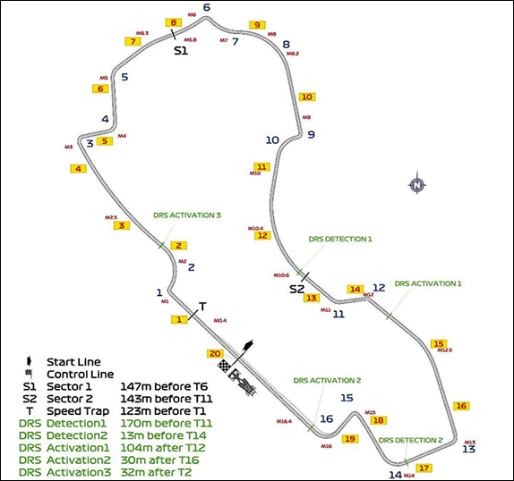 Новая зона DRS расположена на скоростном участке между 12 и 13 поворотами, где гонщики смогут изменить положение управляемого элемента заднего антикрыла, если в точке замера скорости за 170 метров до 11 поворота расстояние между машинами окажется меньше секунды.