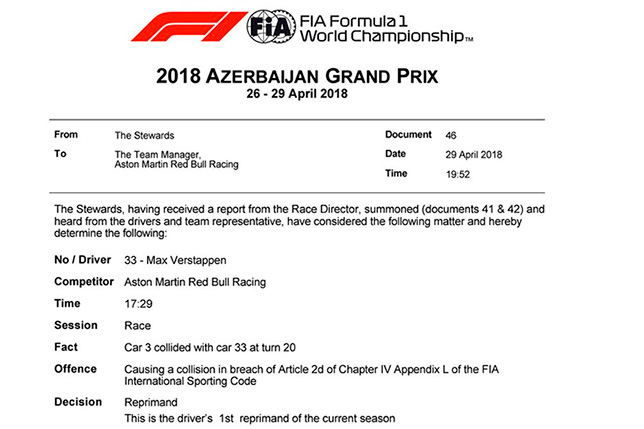 Стюарды Гран При Азербайджана наказали обоих пилотов Red Bull Racing за инцидент на 40-м круге гонки. Даниэль Риккардо пытался опередить Макса Ферстаппена на главной прямой, но в результате машины столкнулись, и оба гонщика выбыли из борьбы.