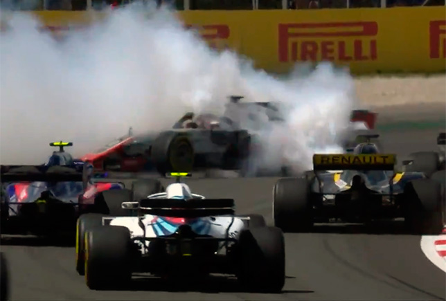 Одним из ключевых моментов Гран При Испании стала авария на первом круге гонке, когда в развернувшуюся машину Грожана врезались Нико Хюлкенберг и Пьер Гасли, и на трассу выехал автомобиль безопасности. Из-за обломков на трассе пришлось совершить пит-стоп также Хартли и Сироткину, что испортило гонку для обоих.