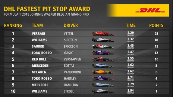 Самый быстрый пит-стоп во время гонки в Спа провели механики Ferrari – они обслужили машину Себастьяна Феттеля за 2,29 секунды. Второй по скорости пит-стоп Гран При Бельгии провели механики Williams – им потребовалось 2,32 секунды, чтобы поменять шины на машине Сергея Сироткина. Третий по скорости пит-стоп у Sauber – машину Маркуса Эриксона механики команды обслужили за 2,45 секунды.