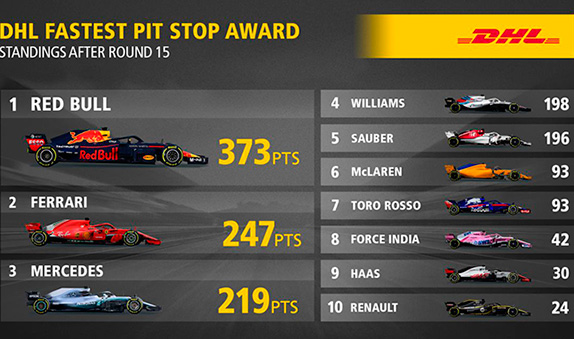 В первой тройке по скорости пит-стопов в Сингапуре так же Red Bull Racing, обслужившие машину Риккардо за 2,31 секунды, и Mercedes, сменившие колёса на машине Боттаса за 2,45 секунды. Вновь неплохо справились в Sauber, пит-стоп Эриксона занял 2,54 секунды.