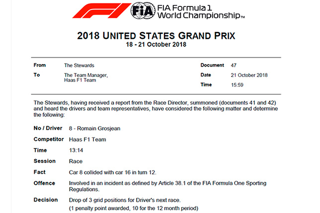 Стюарды Гран При США вынесли наказание Роману Грожану – он потеряет три позиции на старте следующей гонки, которая пройдёт в Мексике через неделю. Роман признан виновным в инциденте с Шарлем Леклером, в результате которого Sauber монегаска развернуло.