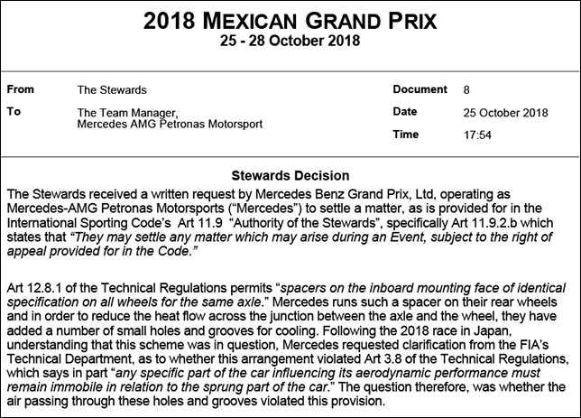 Стюарды обратились к техническим службам FIA – те подтвердили законность решения, а стюарды сделали его официальным – но только в рамках этого Гран При и ограничиваясь конкретным решением.