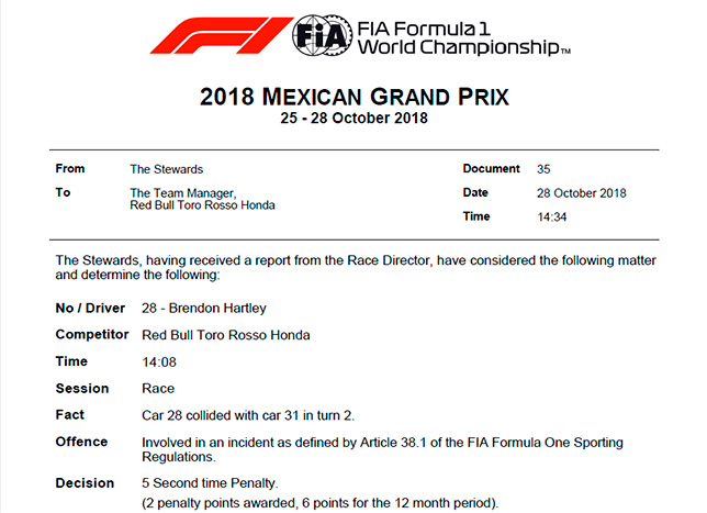 Брендон Хартли в Мексике финишировал 12-м, но в итоговом протоколе оказался 14-м, позади Лэнса Стролла и Сергея Сироткина. Это произошло из-за того, что к его результату было добавлено 5 секунд: стюарды наказали новозеландца за инцидент с Эстебаном Оконом во втором повороте – Хартли не оставил сопернику места.