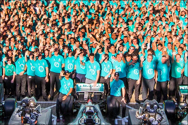 Мы – лишь вторая команда, кому удалось стать чемпионами мира пять лет подряд. Год получился сложным, несколько раз после гонки мы с вами говорили о том, что должны признать поражение, но в итоге мы оказались сильнее. Давайте будем и дальше работать с хорошим настроением, а прессинг соперников будет ещё теснее сближать нашу команду. Я чувствую, что наши сердца бьются в унисон, и я не мог бы чувствовать себя более счастливым. Спасибо вам за блестящую работу».