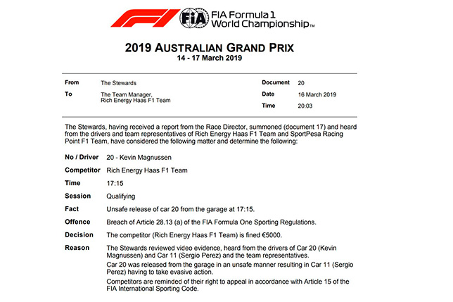 Команда Haas F1 оштрафована на 5000 евро за небезопасный выпуск на трассу машины Кевина Магнуссена во время квалификации - датчанин едва не столкнулся c Серхио Пересом.
