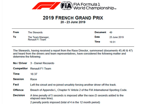 После длительного разбирательства стюарды Гран При Франции приняли решение оштрафовать Даниэля Риккардо за события на последнем круге гонки, причём дважды.