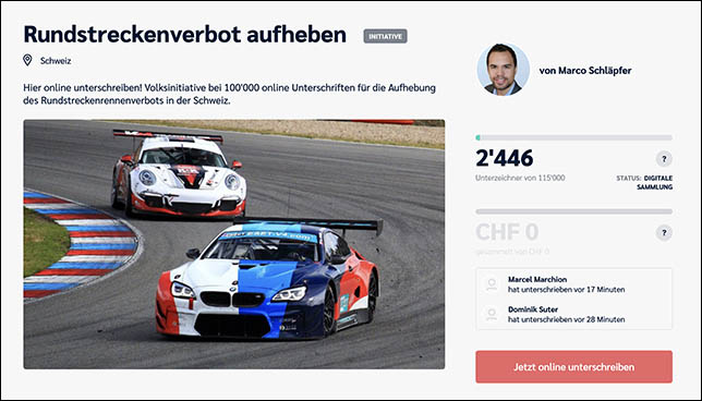Местный активист Марко Шлепфер справедливо считает запрет устаревшим и борется с ним лично, опубликовав петицию за его отмену. Пока набрано лишь 2446 голосов, но Марко с оптимизмом оценивает свои шансы, ведь современные кольцевые гонки весьма безопасны – и интерес к ним в Швейцарии очень велик.
