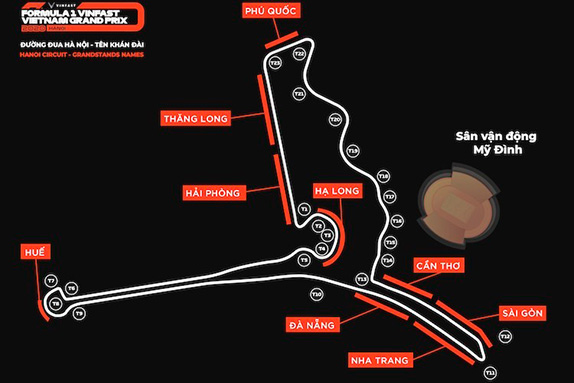 Тем временем организаторы представили официальный логотип трассы, а также названия трибун. Всего трибун на трассе девять, и все они получили названия в честь вьетнамских городов и известных мест. Главная трибуна получила имя в честь исторического названия Ханоя, Тханг-Лонг. Зрительские места напротив поворотов 2, 3 и 4 названы в честь залива Халонг.