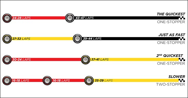 Стратегия двух пит-стопов ещё больше уступает по времени. Тем, кто выберет такой вариант, в Pirelli рекомендуют проехать два отрезка по 16-18 кругов на Soft, а потом перейти на Medium или Hard, в зависимости от ситуации в гонке.