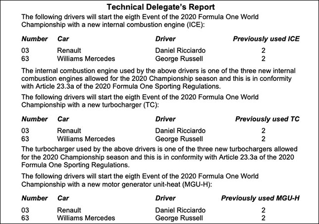 Оба гонщика получили третий в этом году двигатель внутреннего сгорания, третью турбину и третий MGU-H. Риккардо поставят и третий MGU-K.