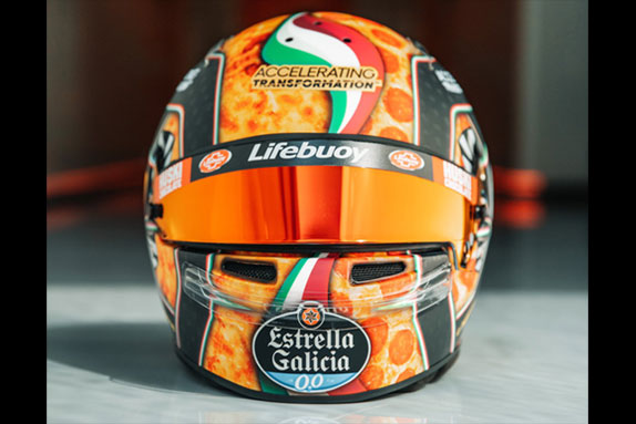 Весьма оригинальный шлем получился у Ландо Норриса, отдавшего должное итальянской кухне. Помимо итальянского флага, гонщик поместил фотографии пиццы.