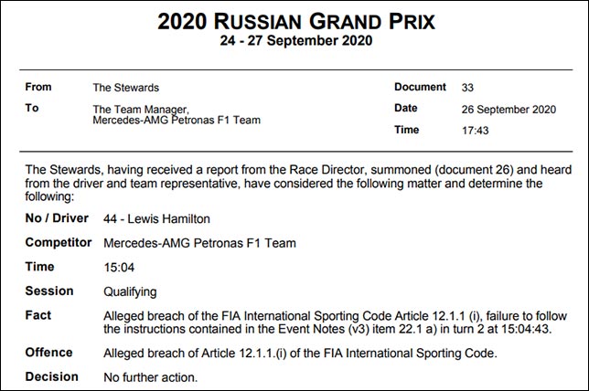 Стюарды установили, что никто из гонщиков не получил преимущества, поскольку время на круге было аннулировано, но предупредили о том, что в гонке такое нарушение скорее всего приведёт к пятисекундному штрафу.