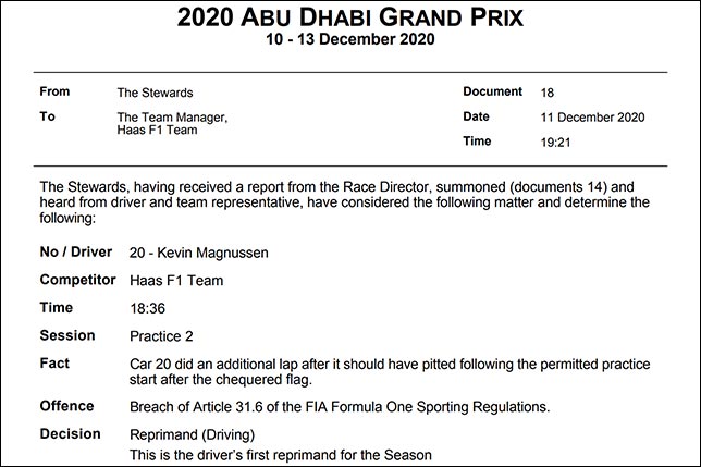 Стюарды Гран При Абу-Даби рассмотрели ситуацию, когда после окончания второй тренировки Кевин Магнуссен не вернулся в боксы, когда на светофорах загорелся красный, а проехал дополнительный круг.