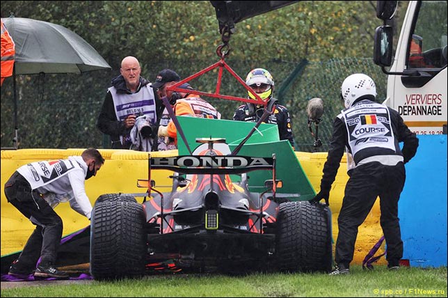 Серхио Перес вылетел с трассы на установочном круге перед стартом Гран При Бельгии, врезался в барьер и сломал подвеску.