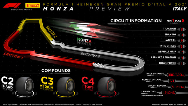 На Гран При Италии шинники из Pirelli привезут «среднюю» тройку составов – С2, С3 и С4. Этап в Монце пройдёт по новому формату гоночного уик-энда с субботним спринтом. Каждый гонщик получит 12 комплектов шин: два комплекта Hard, четыре комплекта Medium и шесть Soft. На случай осадков гонщики получат по шесть комплектов промежуточных шин и три комплекта дождевых.