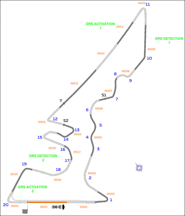 Точка замера интервала перед второй зоной DRS расположена через 65 метров после 18-м поворота, а точка активации – через 80 метров после 20-го.