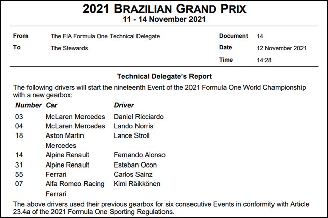 Для Риккардо, Норриса, Стролла, Алонсо, Окона, Сайнса и Райкконена это плановая замена – на их машинах коробки проехали положенные по регламенту шесть Гран При.