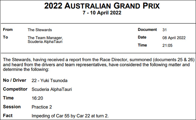 Рассмотрев обстоятельства инцидента, произошедшего во второй тренировке, когда Юки Цунода помешал во втором повороте Карлосу Сайнсу, находившемуся на быстром круге, стюарды Гран При Австралии вынесли официальное предупреждение японскому гонщику.