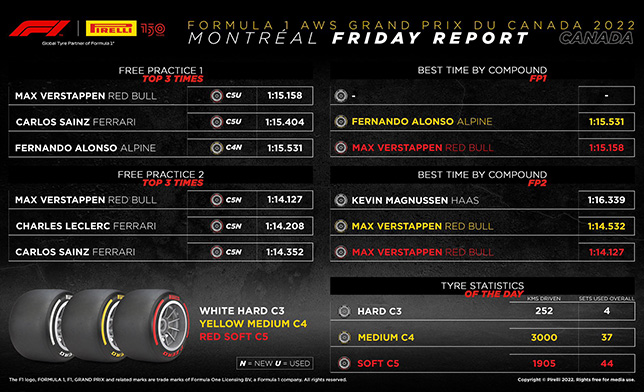 В центре внимания были шины Soft. Даже на скользкой трассе в пятницу утром они быстро изнашивались. Шины Hard использовались гораздо реже, возможно потому, что команды берегут его для гонки. Пока погода в Монреале крайне непредсказуема, мы ожидаем, что так будет до конца уик-энда».